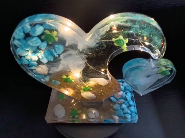 Herz mit Herzanhänger am Strand mit Licht